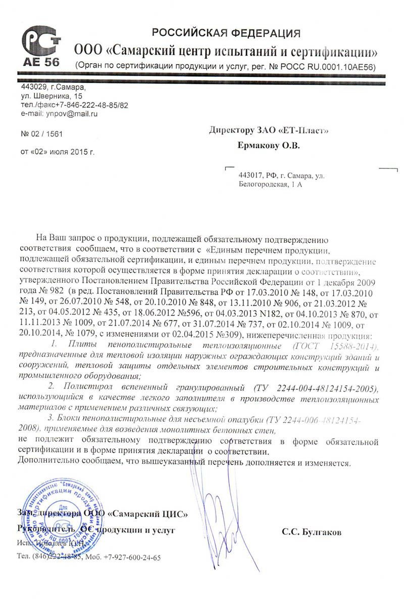Информационное письмо о принадлежности продукции к объектам обязательной сертификации
