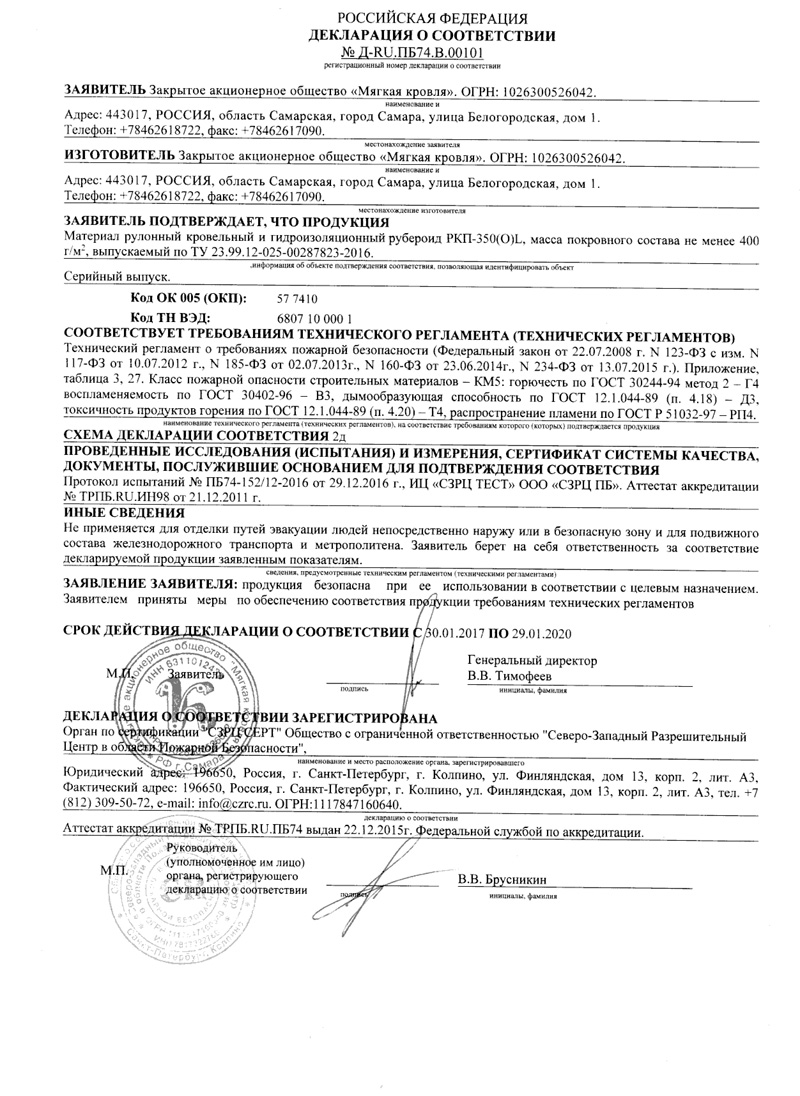 Рубероид РКП-350 ТУ. Декларация о соответствии