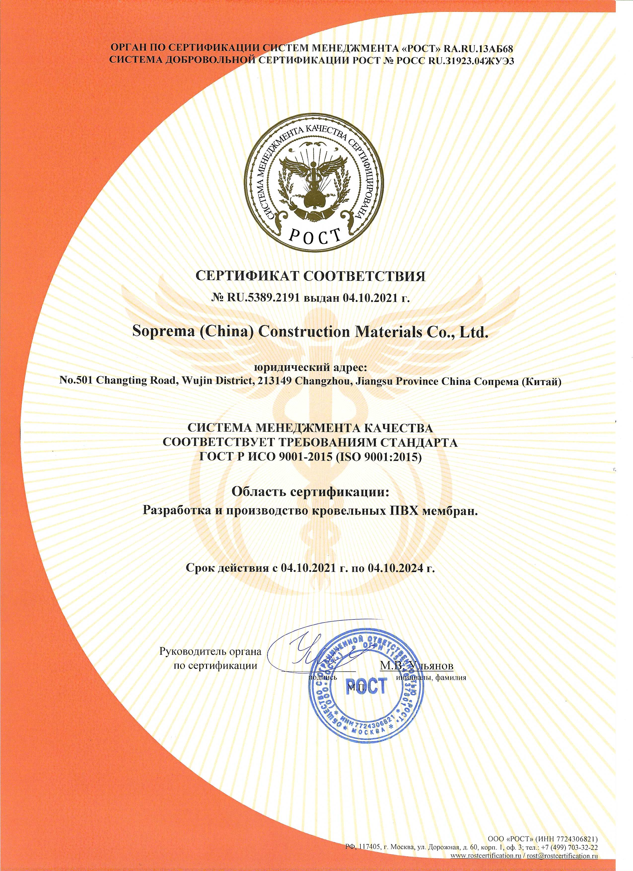 Сертификат соответствия Soprema (China) ИСО 9001
